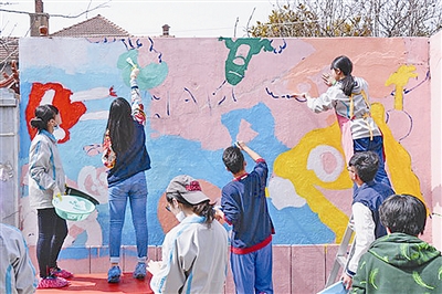 ■日前,青島六中學生志愿者發(fā)揮專長,為學校周邊社區(qū)進行墻繪美化。